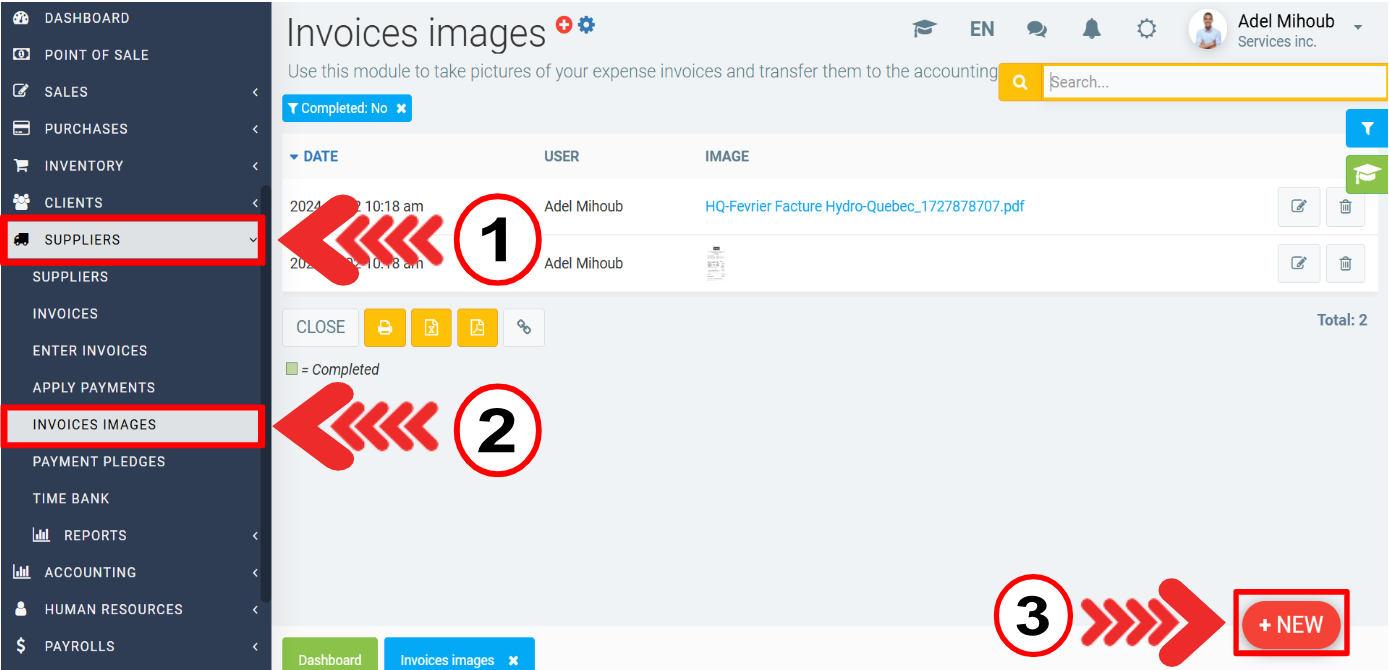 You can also access the Invoice Photos module by clicking on Suppliers > Invoice Images in the left menu. To add photos from this page, click on the red + New button.