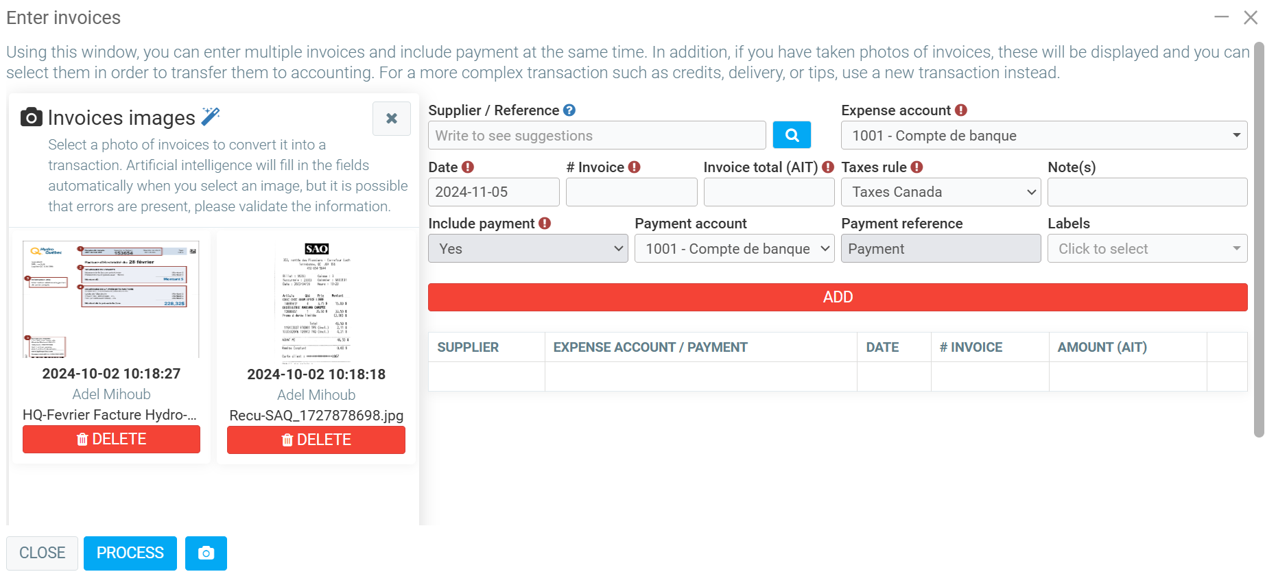 A window entitled Insert invoices will appear on the screen. Your photos will be on the left, under the heading Invoice photos (see image below). If there are no photos waiting to be processed, the Invoice photos section will not be available.