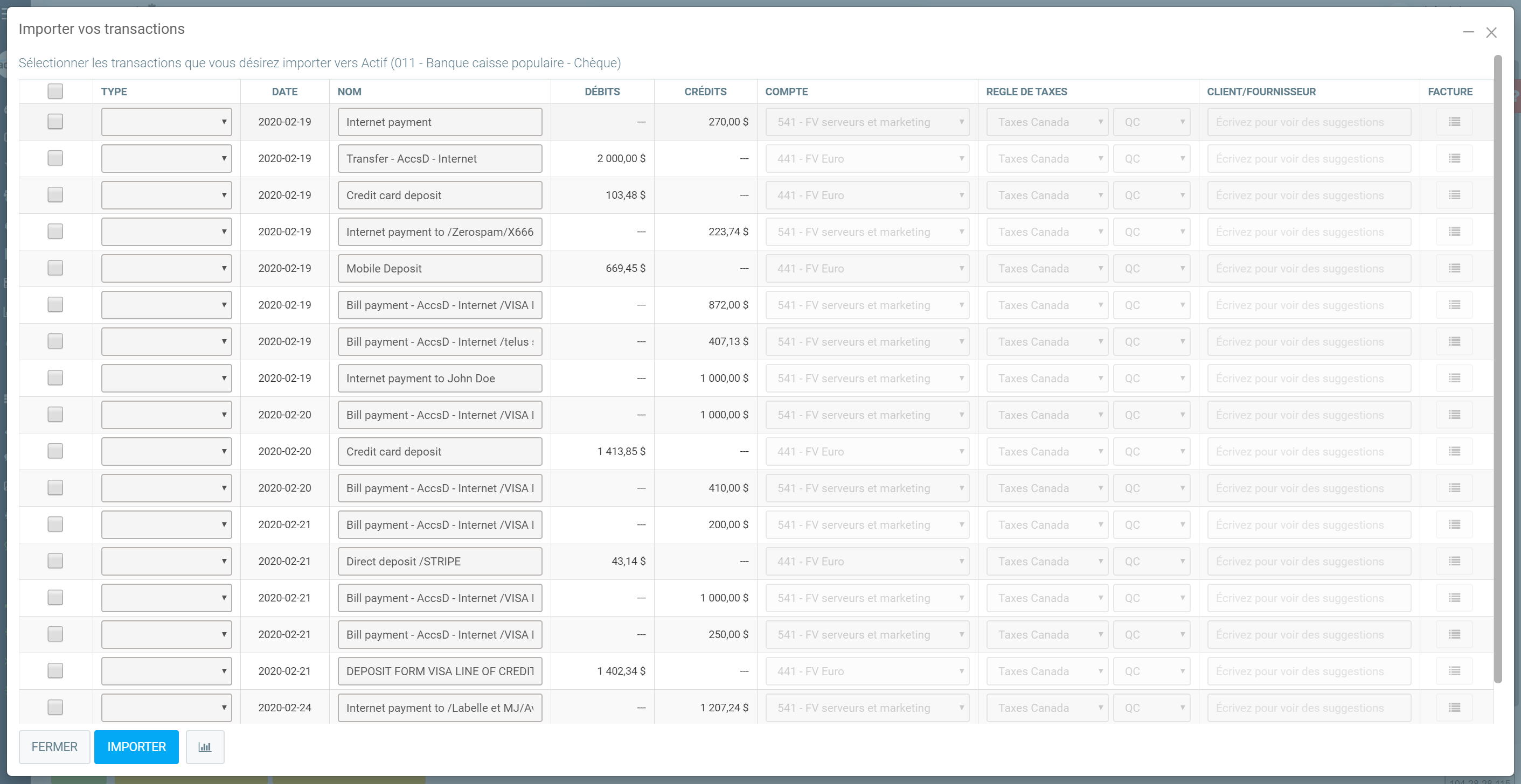 Your settings are saved and become your default during your next imports. For example, if you associate the fuel account and a tax rule with your first gasoline transaction, the next time you import a transaction of the same type, the account and tax rule will be applied by default.