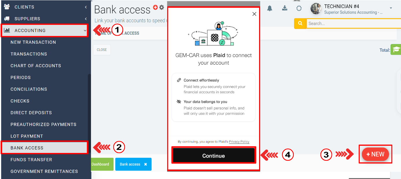 In the left menu, click Accounting > Bank Access. Next, click the red +New button in the lower right corner. A dialog box will appear. Click on Continue.