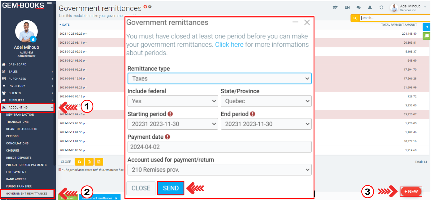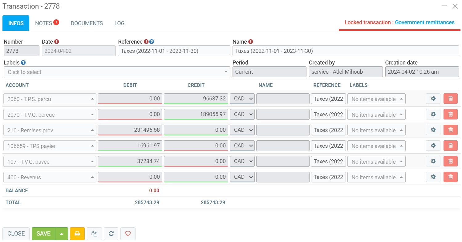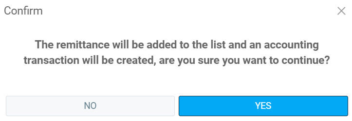 A dialog box will appear with the following message: ''The remittance will be added to the list and an accounting transaction will be created, are you sure you want to continue?''. Click on Yes.