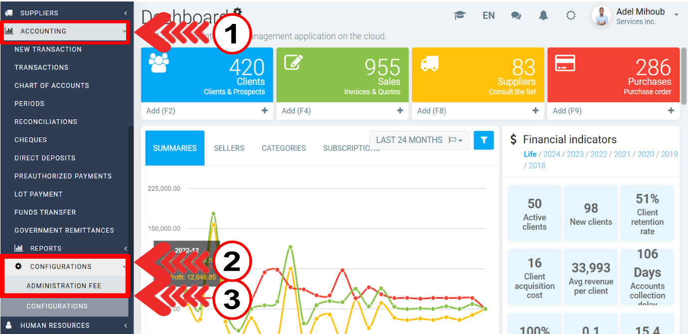 To configure your fee rules, go to Accounting > Configurations > Administration fees.