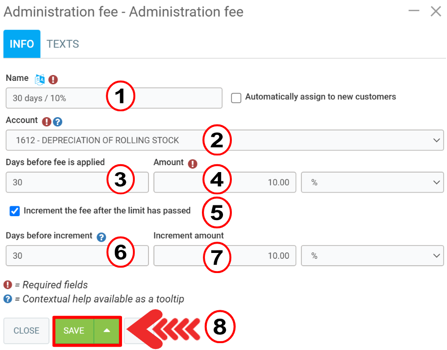 - Account: The charter account that will be used for payments with administration fees. Days before fee is applied: For example, if the fee is after 30 days of non-payment, enter 30.