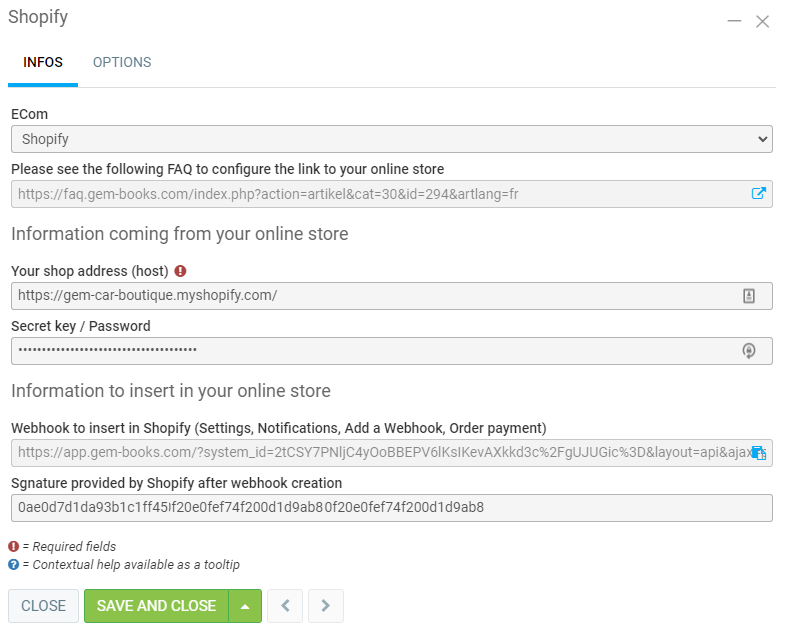 While you are on this window in GEM-BOOKS, copy the (long) Webhook to insert into Shopify.