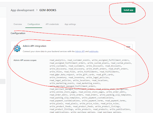 After creating the application, you must go to the Configurations tab to give all Admin API rights, and then click the install application button.