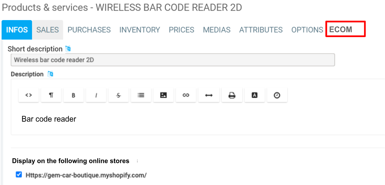 In the GEM-BOOKS Configurations, Configurations menu, go to the ECom tab and click on the +NEW button in red to create a new store. From the ECom drop-down menu choice, select Shopify.