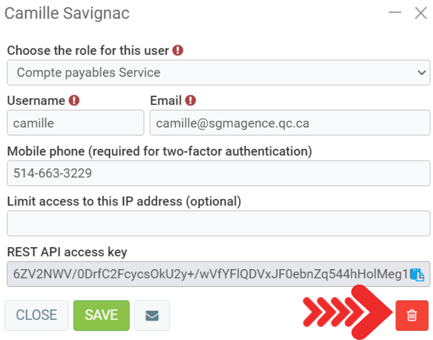 In the window that appears on the screen, if you wish to delete this user, click on the red trash can in the right corner of the page.
