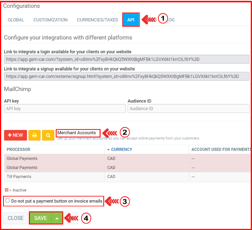 Then go to Configurations > Configurations > API > Merchant Accounts > +New.
