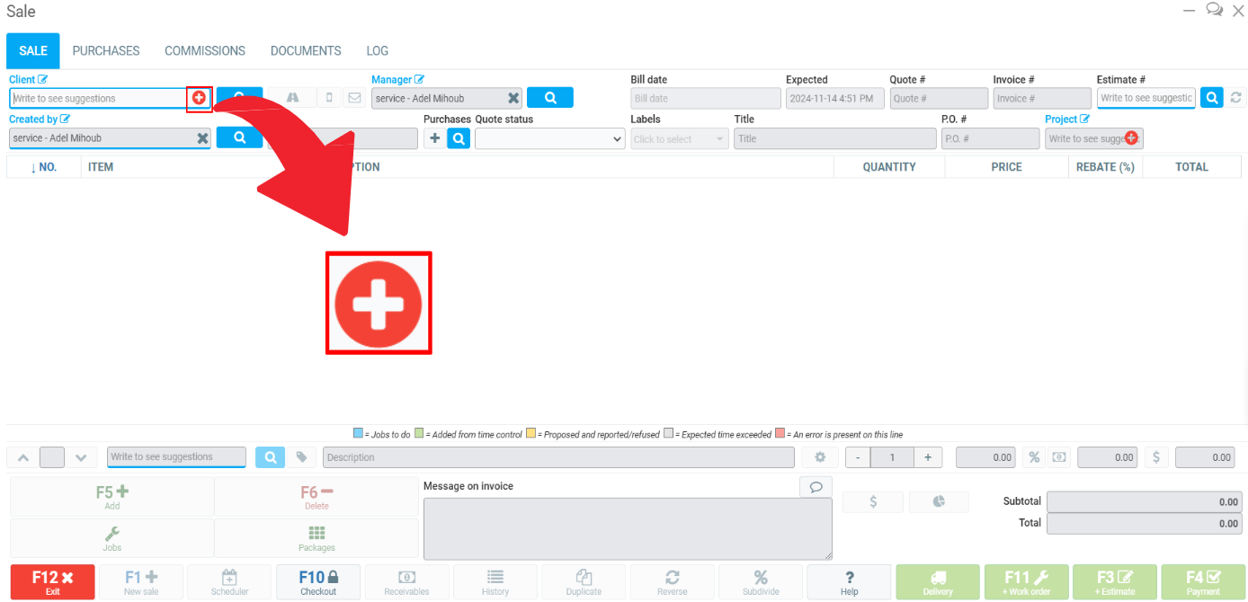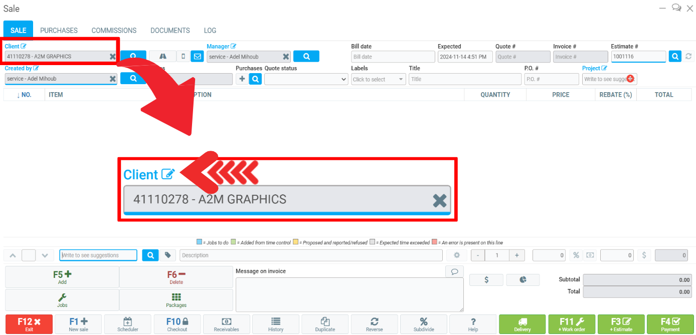 Type the phone number or name of the client in the field Client and press Enter or click the magnifying glass to see the list of clients existing.
