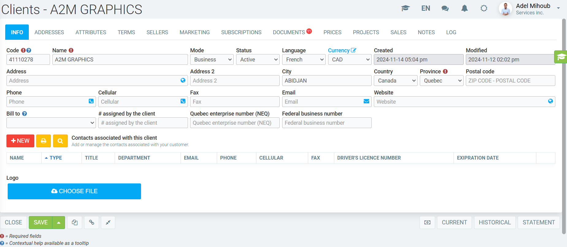 Note that when you have already selected a customer and wish to make changes to their file, such as changing their phone number, simply click on Client, shown in blue above the text box.