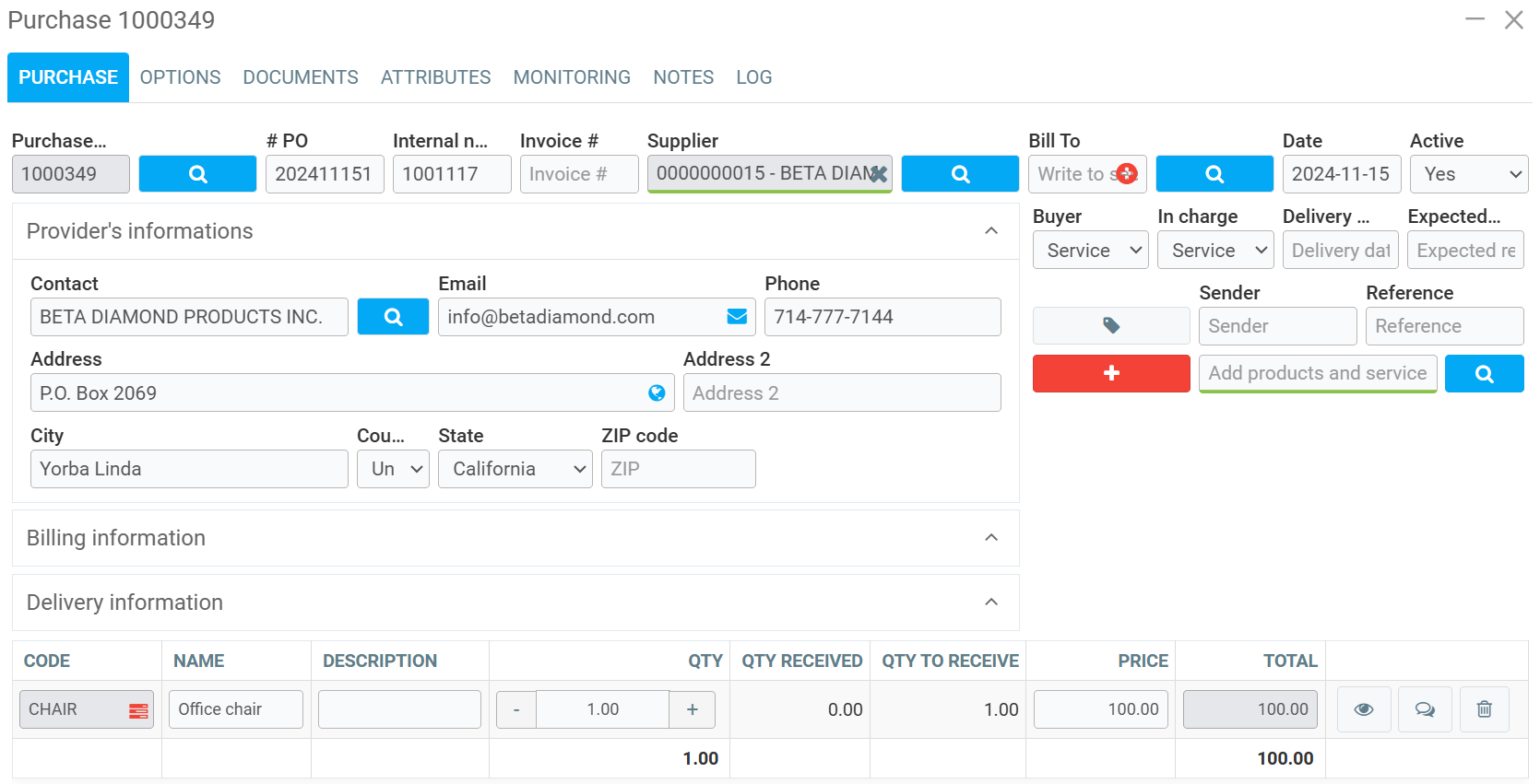 After clicking on the + sign, another purchase window will open. It is necessary to select the supplier, the products and services.