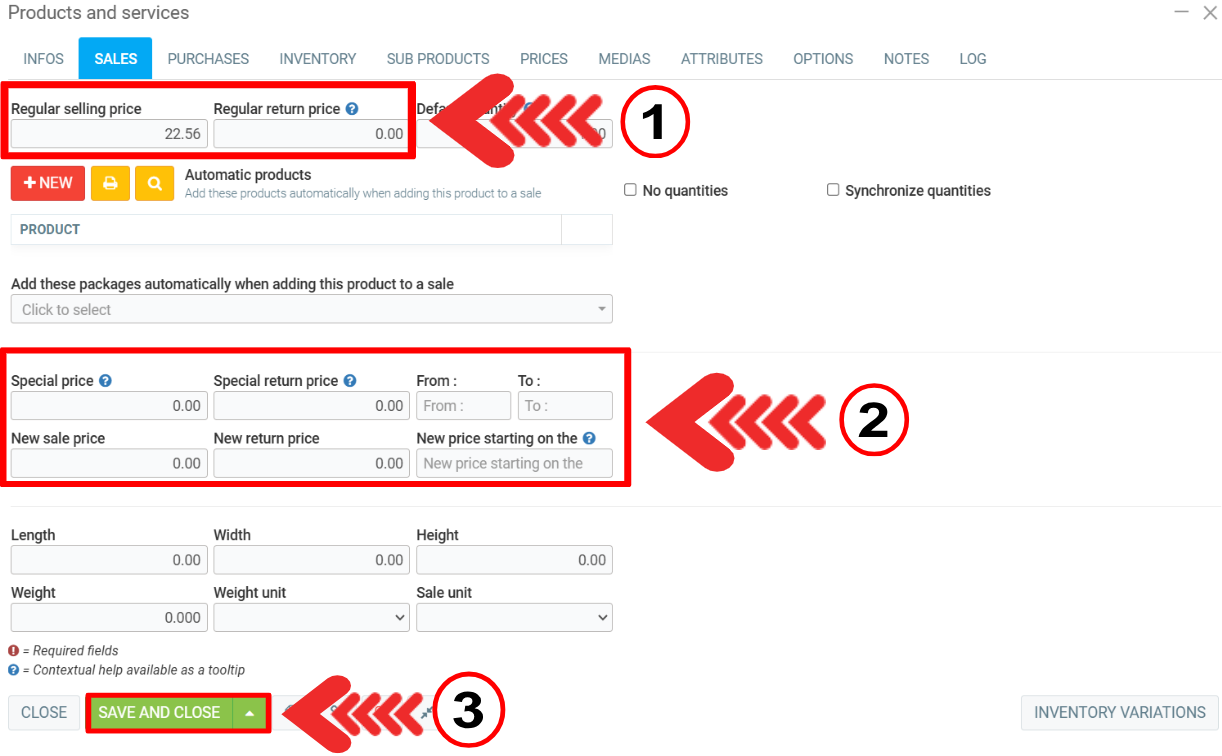 Click on the Sales tab, you can modify the regular selling price and return price.