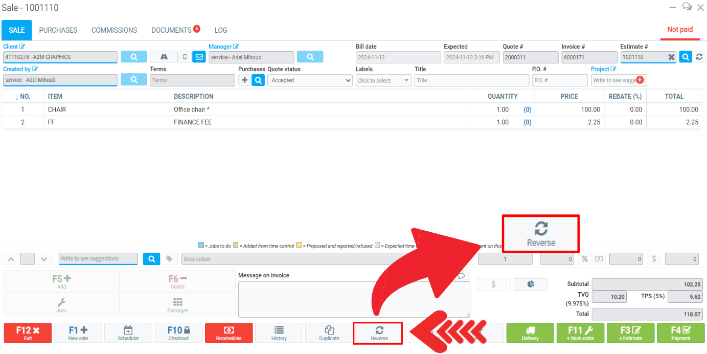 When you click on the button, GEM-BOOKS will ask you to confirm the action: ''Are you sure you want to reverse this sale?''. Click on Yes.