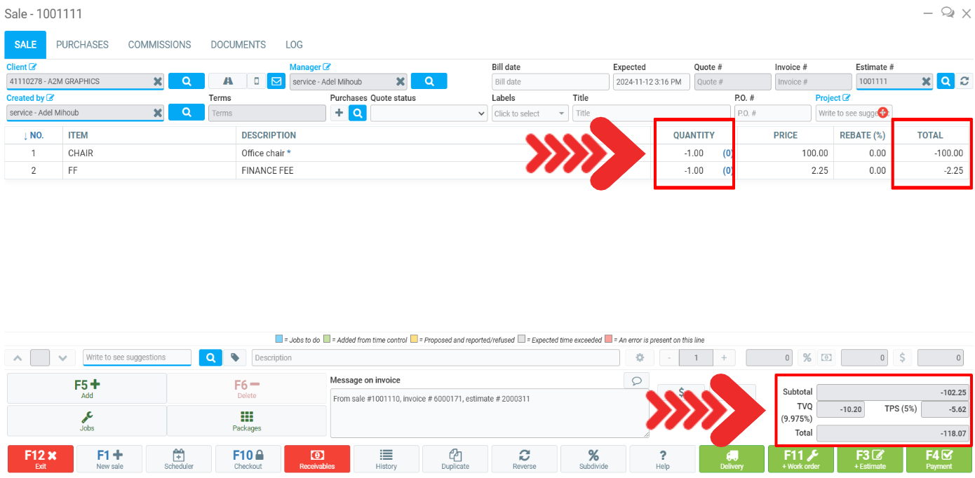 All billable amounts on this sale will also be negative, as will the subtotal, applicable taxes and total.