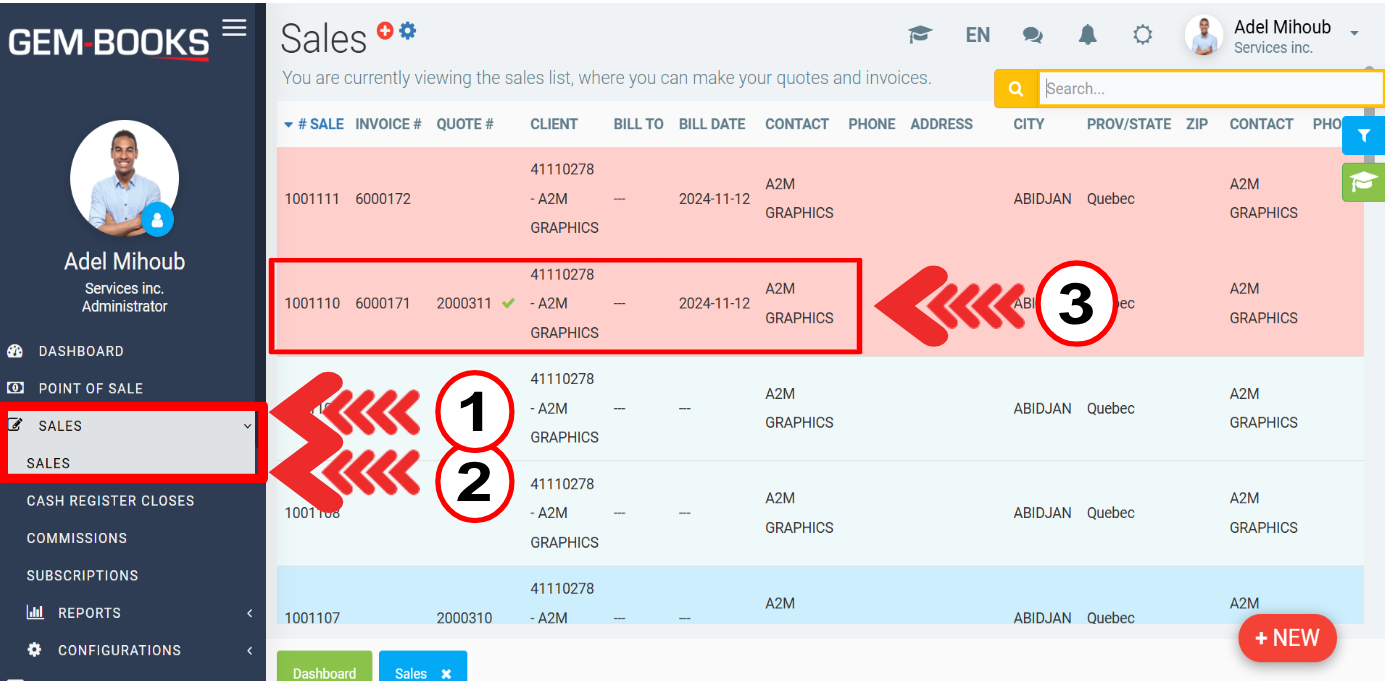 In the menu on the left, click on Sales > Sales to display the Sales list.