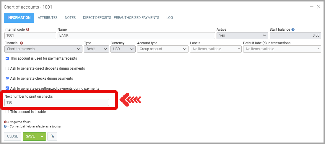 Once the account is selected, switch to the Information tab, locate the Next Number to Print on Checks field and enter the next check number that should be used for printing.