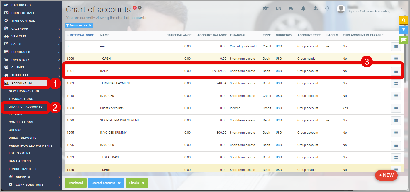 From the left main Menu, click on Accounting > Chart of Accounts.