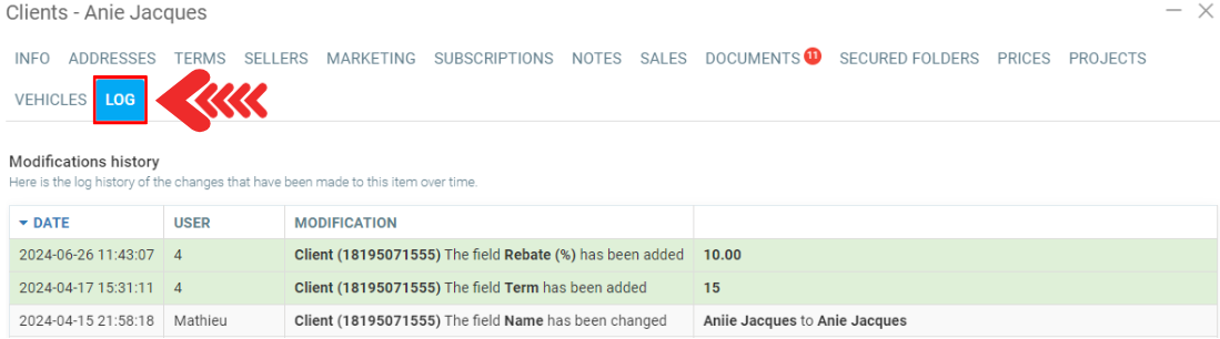 This part allows you to have an overview of the evolution of your Client record, and eventually control these movements. All users with the necessary authorizations in GEM-CAR in your company can add information about the Customer, send him an email, and collect payment. All these operations are logged in the Log tab of the client's file, vehicle's file, or any other items you might be looking at.