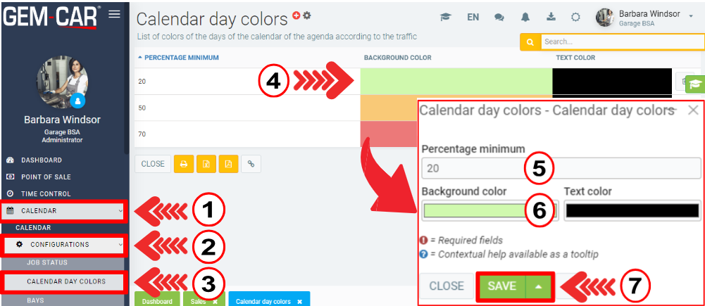 To modify the color of your calendar click on Calendar > Configurations > Calendar Day Colors.