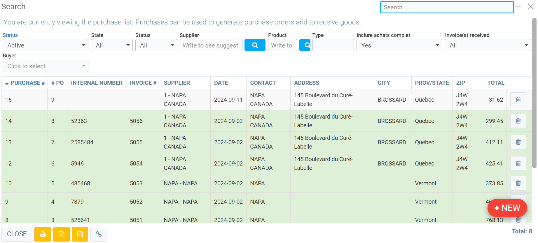 You can select one, search by Status, State, Supplier, Product, Type or create one by clicking on the red +New button.