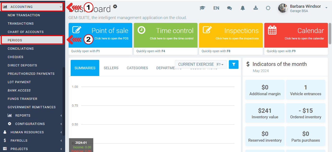 To close a period in GEM-CAR, go to the menu on the left and click on Accounting > Periods.