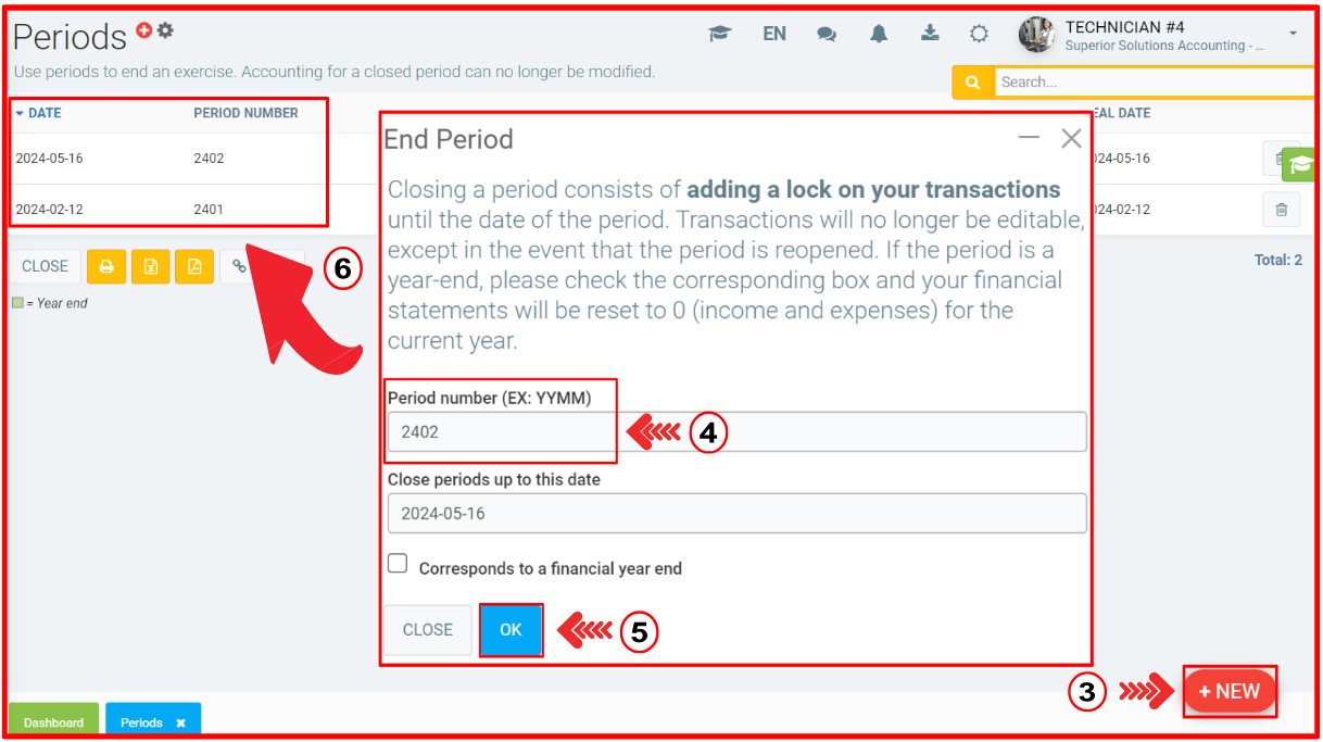 To close a period, click on the +New button at bottom right.
