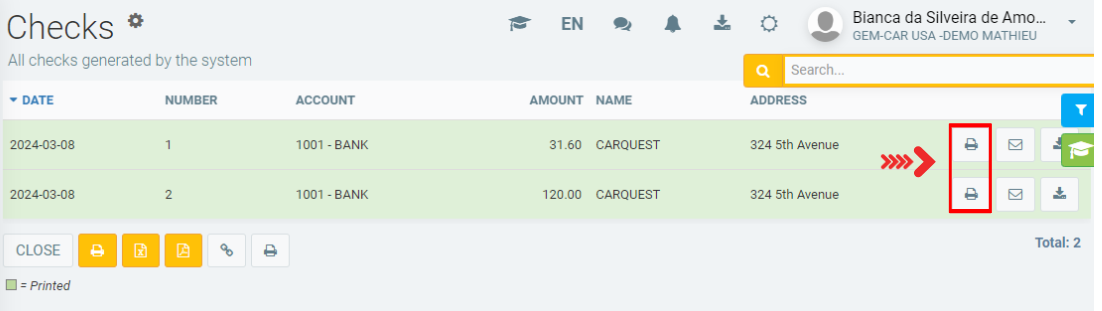 If the check is not appearing in the list, remove the filter from the top right of the page and select “all”. This way, all checks will appear for reprinting.