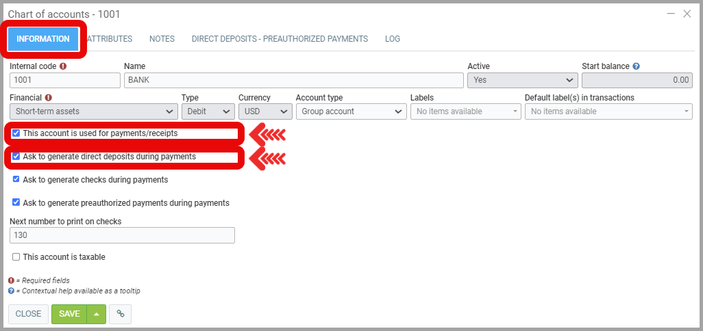 Under the Information tab, make sure to check This account is used for payments/receipts and Request to generate checks when paying.