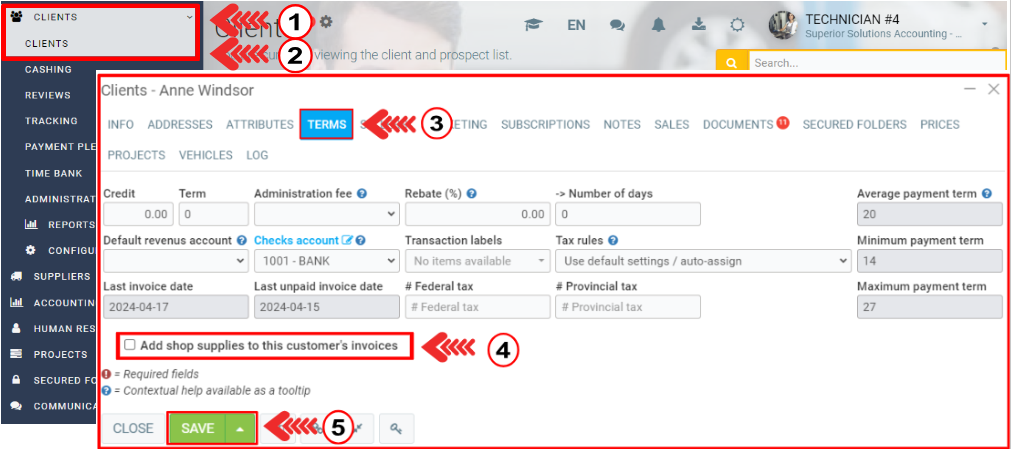 Click on Terms, check the option ''Add shop supplies to this customer's invoices''. Then click on Save.
