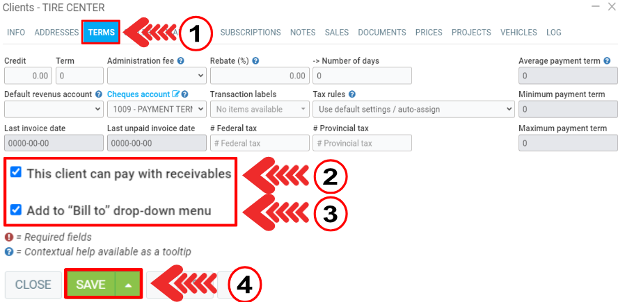 After completing the necessary information in the Info tab, click on the Terms tab.