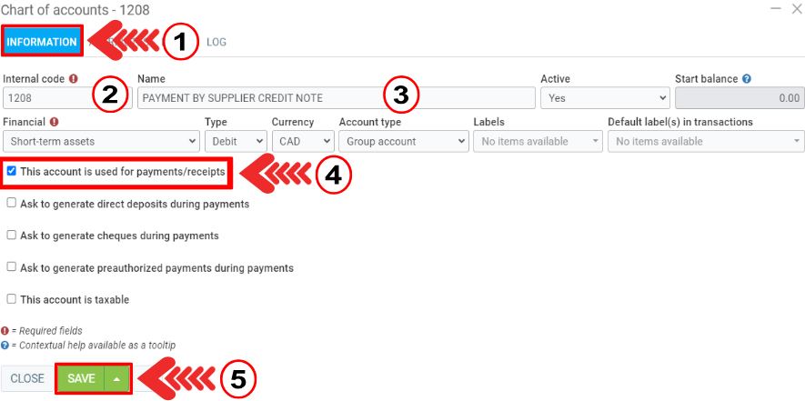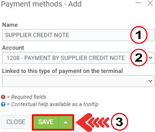 Create payment method: Supplier credit note, and link to GL account “1208 Payment by supplier credit note”. See more about Chart of accounts.