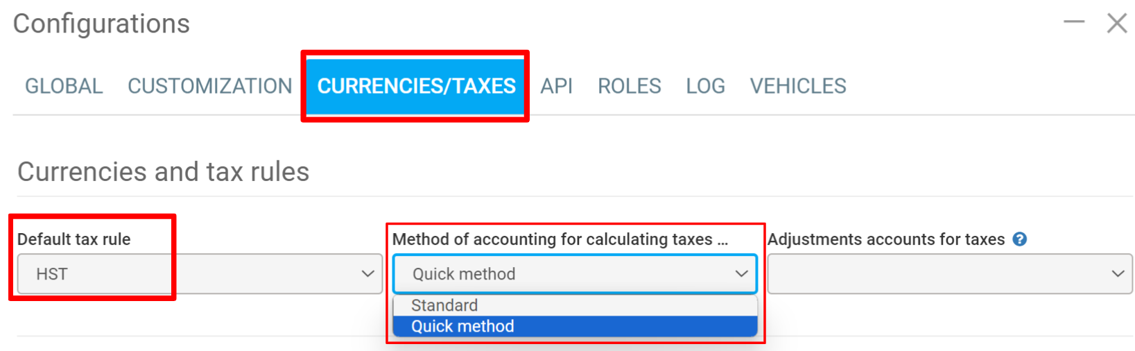 To use the quick tax calculation method, simply go the menu Configurations > Configurations > Currencies/Taxes. Set the tax calculation method field to be reset to Quick method.