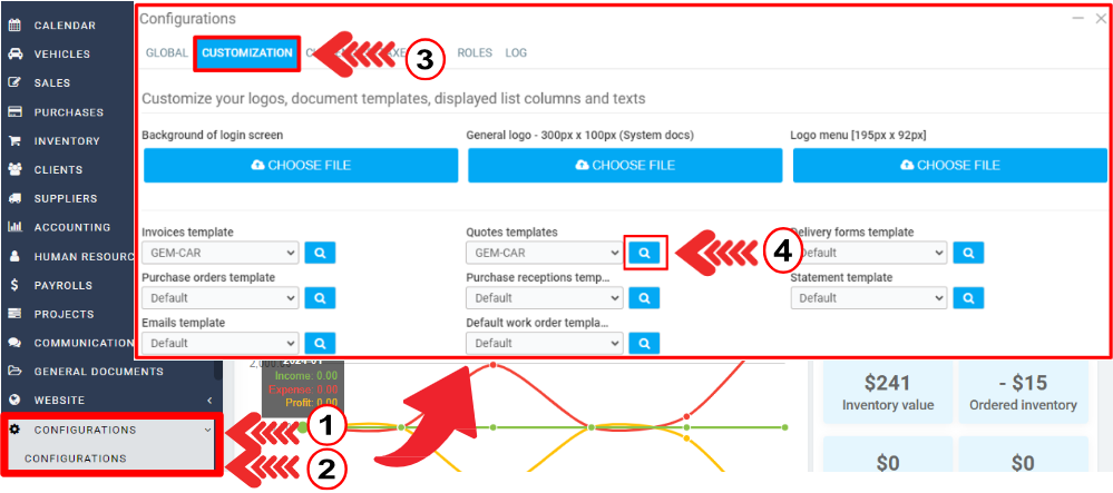 On the main menu click on Configurations > Customization tab.