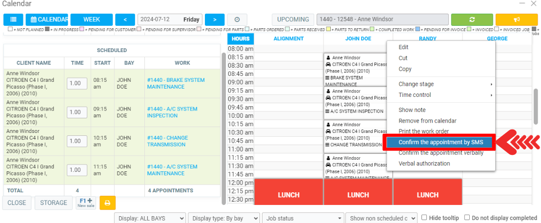 Right-click on the appointment you wish to confirm and select "Confirm the appointment by SMS".