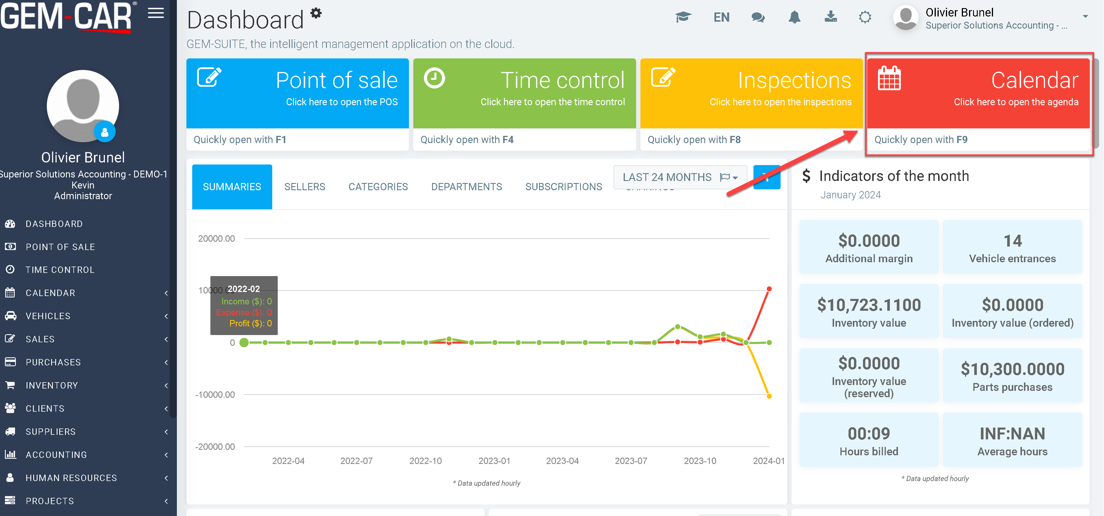 ndar can be opened during any process, at any time, using the F9 key. If you don't have this option, click on the red button at the top right of the page or go to the menu on the left: Calendar > Calendar.