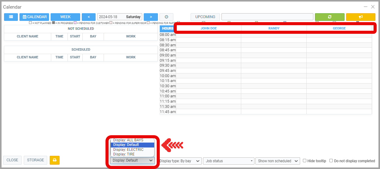 In the Calendar, if you want to choose which bays to display, select one of the options from the menu located at the bottom left of the screen.