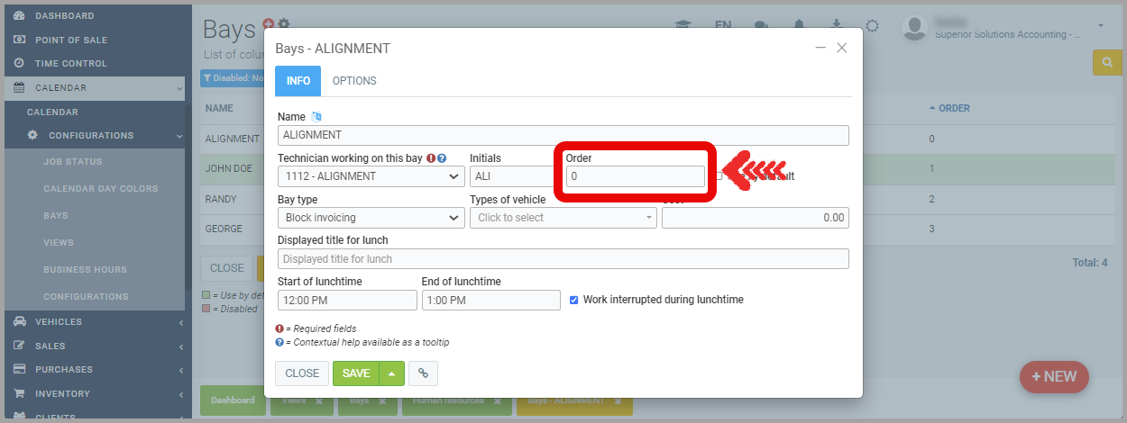 - Change the value of the Order field to give it the new position which would be 2 here. Note that if two Bays have the same number indicated for Order, they will be displayed one after the other.