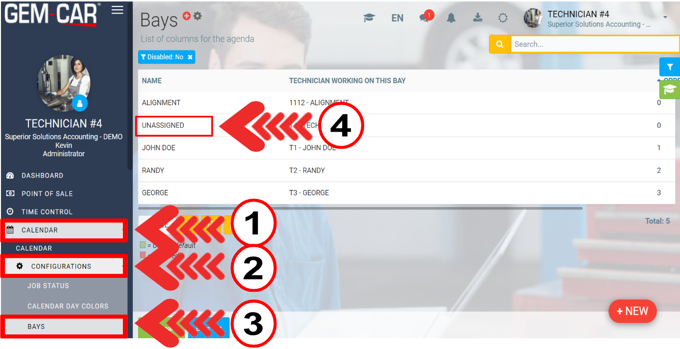 In the menu on the left, click on Calendar > Configurations > Bays and select the Unassigned.