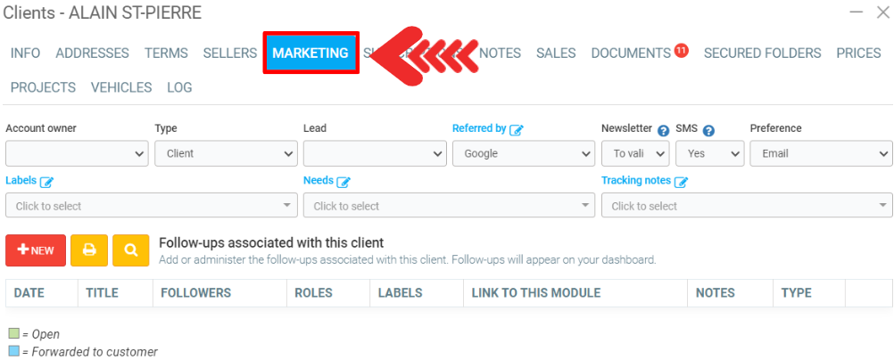 In this tab, you can see the Follow-ups associated with this client, E-mails exchanged with this client and the Categories of items purchased by this client.