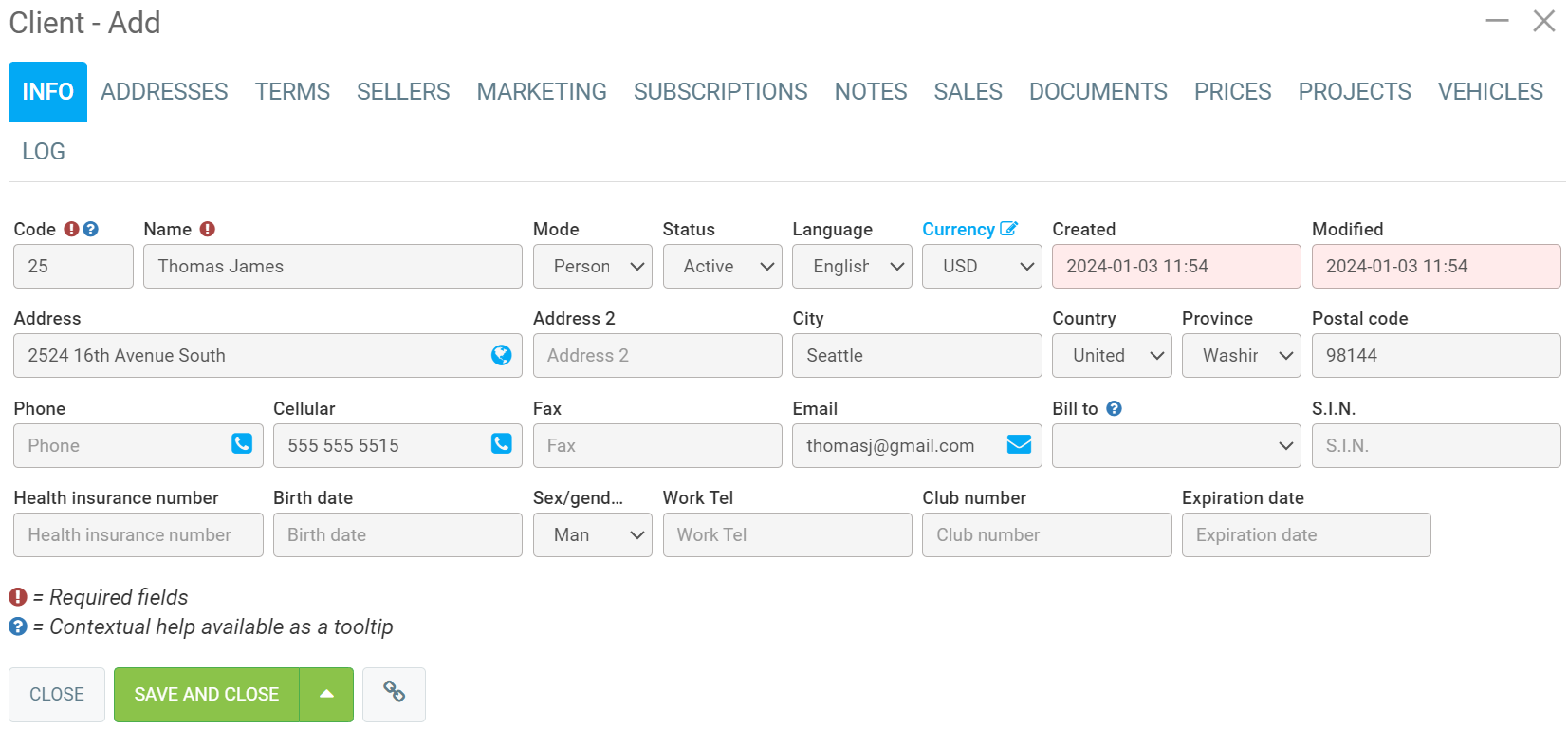 The Client - Add window will open and you can fill in the blanks. The only mandatory field is the code and it must be a unique identifier and can be changed at a later time if needed. For more information regarding the addition of a new client such as cell, address etc. click here.