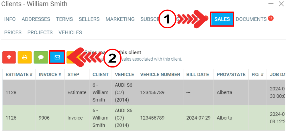 In the customer file, click on the Sales tab and then on the blue envelope icon.