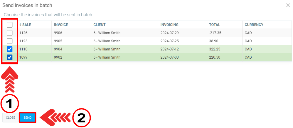 A list of the client's invoices appears. Check the invoices you wish to send by e-mail and click on Send.