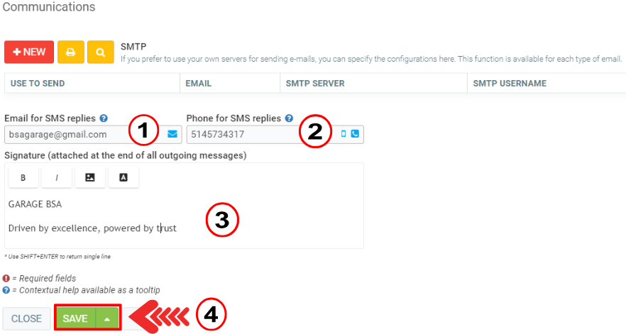 Enter the email address and phone number to be used by GEM-CAR to receive customer SMS replies, and add a signature.