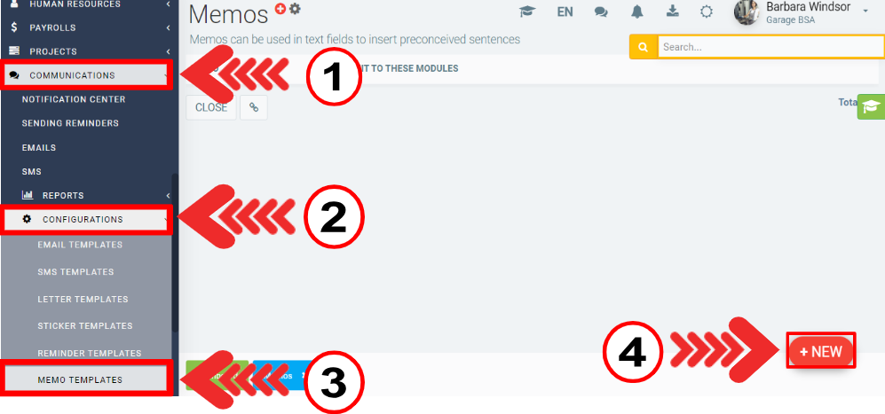 To create a memo template, click on Communications > Configurations > Memo templates > +New.