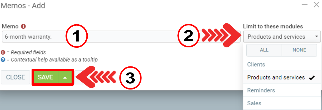 - Limit to these modules (you can choose from the following options: Clients, Products and Services, Reminders, Sales)