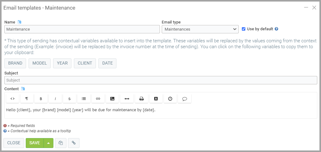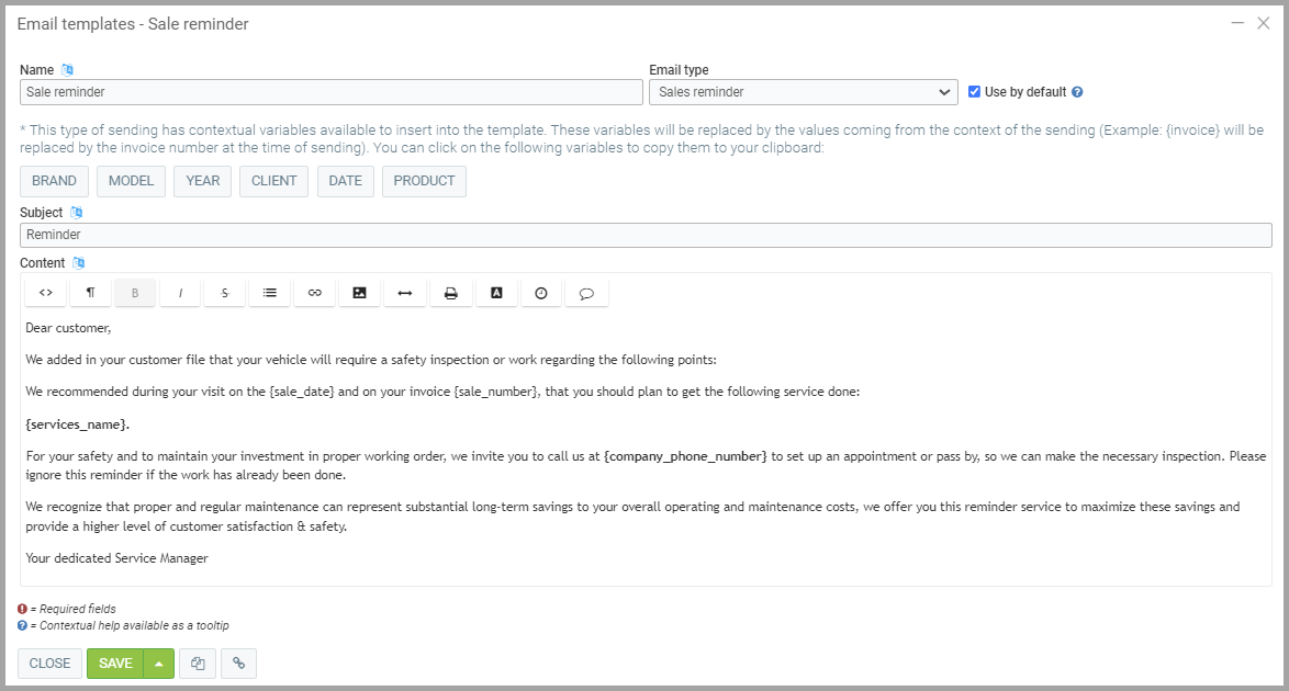 Hello {client}, your {brand} {model} {year} will be due for maintenance by {date}.
