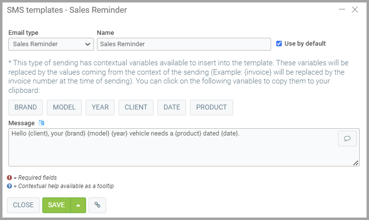 Hello {client}, your {brand} {model} {year} vehicle needs a {product} dated {date}.