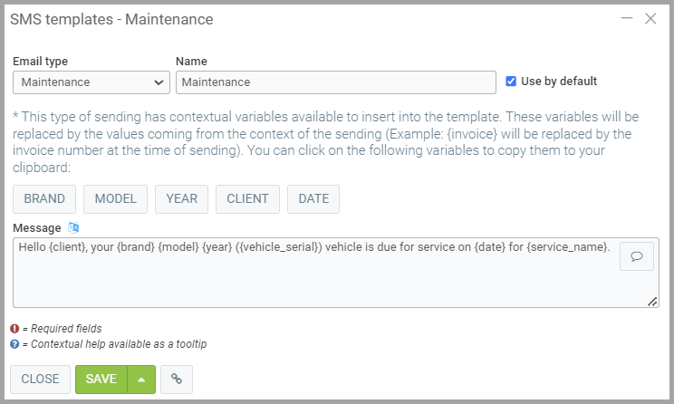 Hello {client}, your {brand} {model} {year} ({vehicle_serial}) vehicle is due for service on {date} for {service_name}.