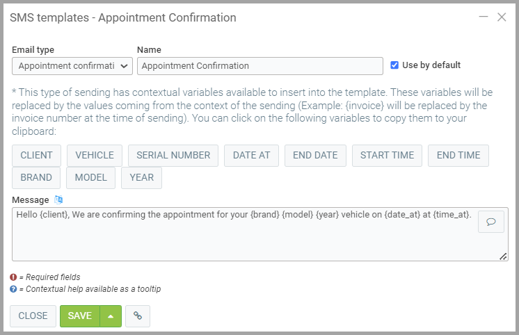 Hello {client}, We are confirming the appointment for your {brand} {model} {year} vehicle on {date_at} at {time_at}.