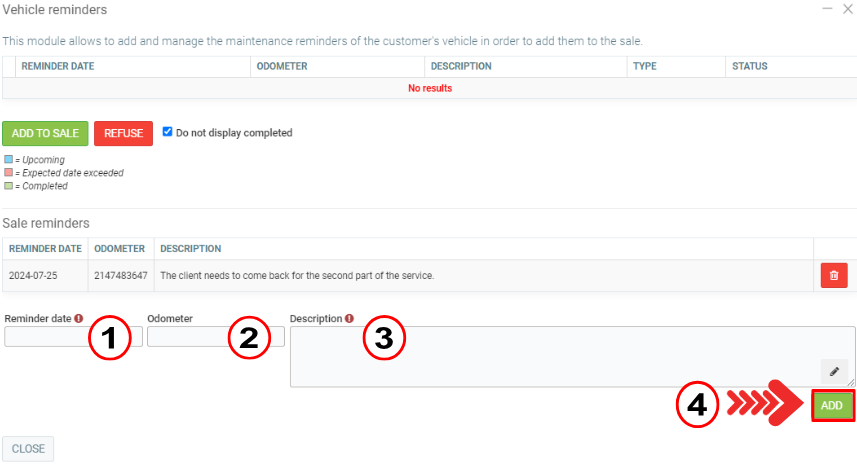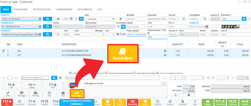 From the Point of Sale, once a vehicle has been added, look at the Reminders button located in the menu at the bottom of the screen.